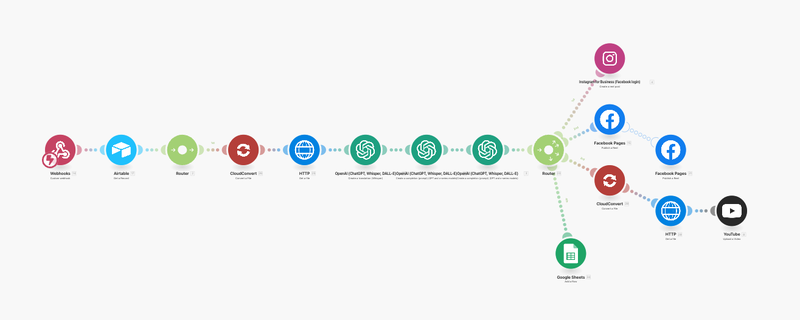 Webhook → AI (OpenAI) → CloudConvert → Facebook, Instagram, YouTube, Google Sheets.
